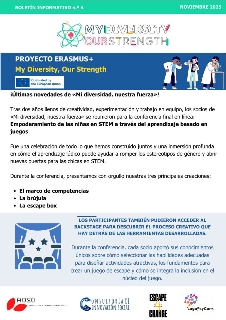 ¡Ya está aquí el cuarto y último boletín informativo! 🎉 Descubre lo más destacado de nuestra conferencia final y de los eventos nacionales, donde compartimos los resultados y reflexionamos sobre todo el recorrido de «Mi diversidad, nuestra fuerza» 🌍✨.