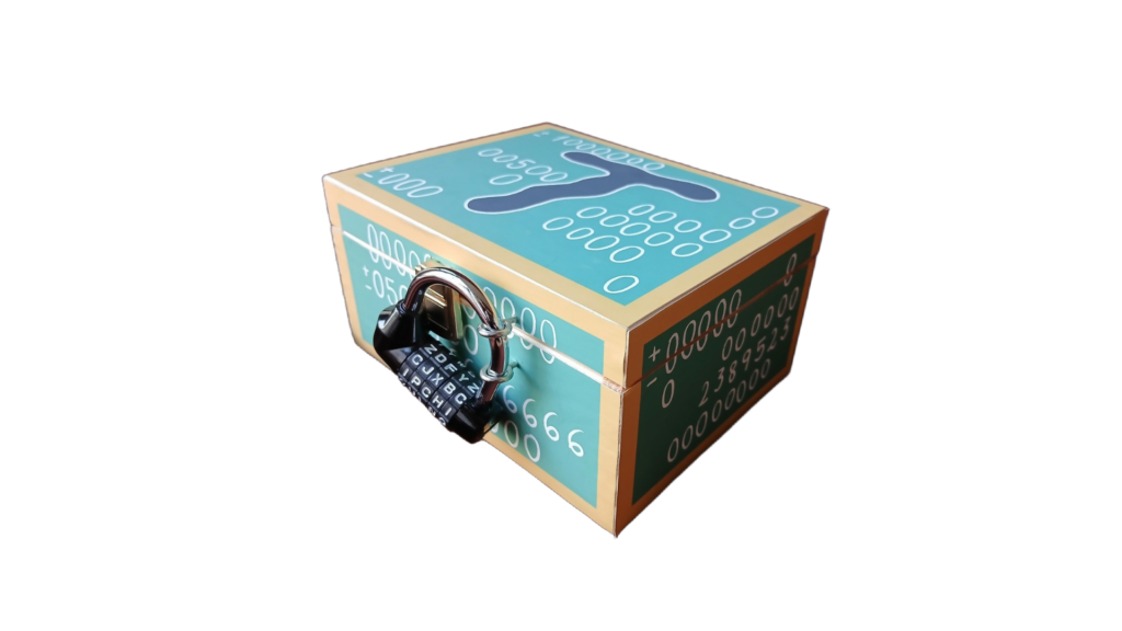 Contiene due pagine di diario su famosi matematici, una cornice con fogli di puzzle con lettere e numeri, una calcolatrice e un post-it con le istruzioni.